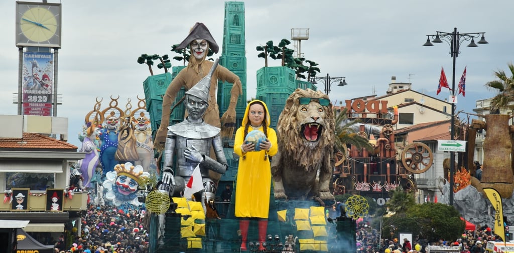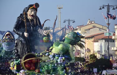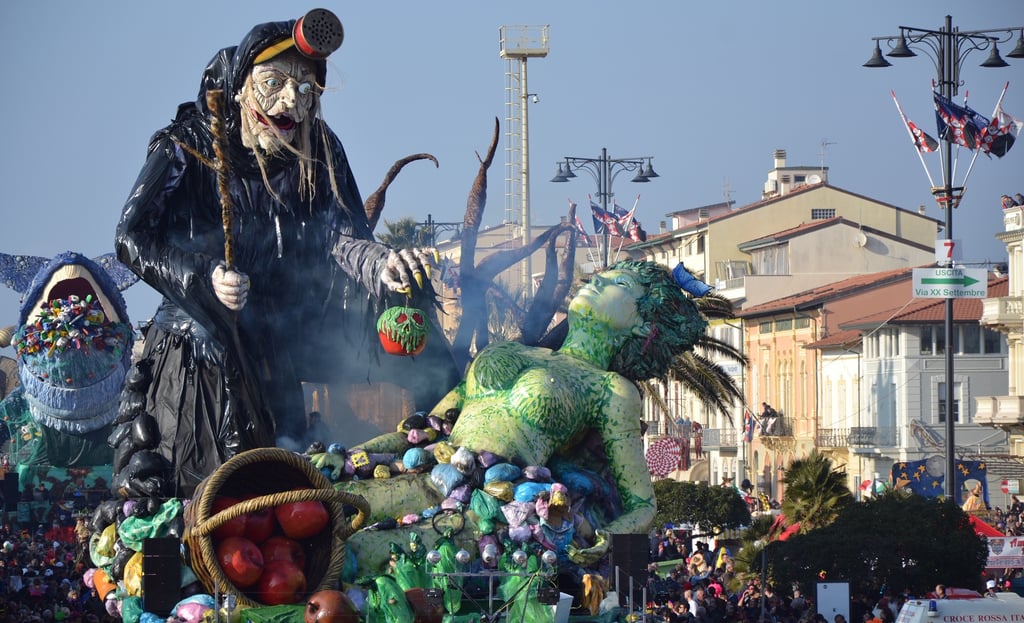 El más convocante del carnaval es el desfile de carrozas gigantes en el Viale Regina Margherita, el paseo costero de la ciudad. Estas carrozas de enormes estructuras de papel maché -algunas pueden llegar a tener hasta 20 metros de altura- representan figuras políticas, celebridades y encarnan temas sociales con un fuerte tono satírico.